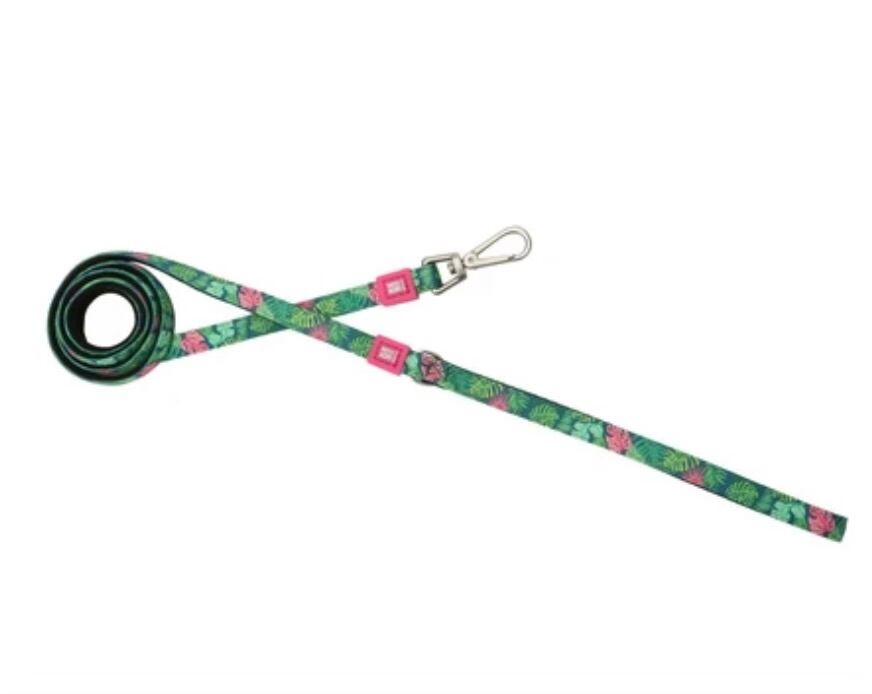 南国を思わせるトロピカルプランツ柄の生地に鮮やかなピンクのロゴがマッチした犬用リードです。ウェットスーツに使われる高機能素材を使っているため、軽量で柔らかく握りやすくて、長時間のお散歩でも手が疲れません。