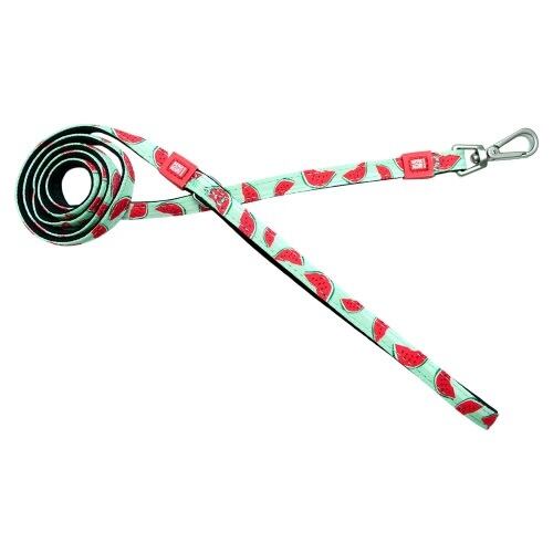 くし形にカットしたスイカをランダムに配した柄の犬用リードです。ウェットスーツに使われる高機能素材を使っているため、軽量で柔らかく握りやすくて長時間のお散歩でも手が疲れません。