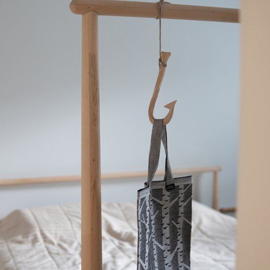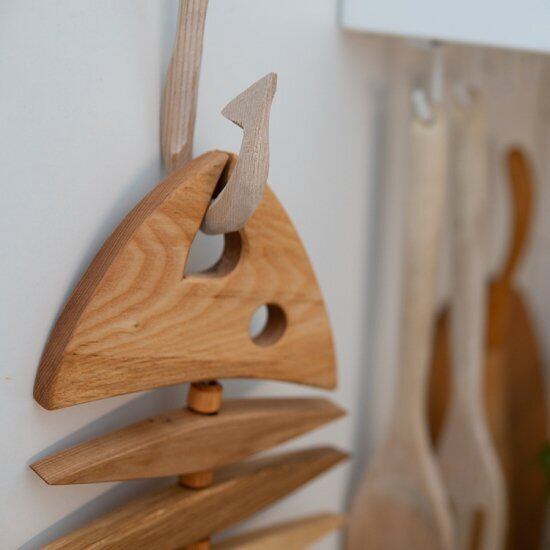 別売りのおさかなフォルムポットマットは、パーツを紐で組み合わせた作りで、それぞれのパーツは自由に動きます。こちらの木製フックと一緒に使えば、キッチンで見せる収納を楽しむことができます。