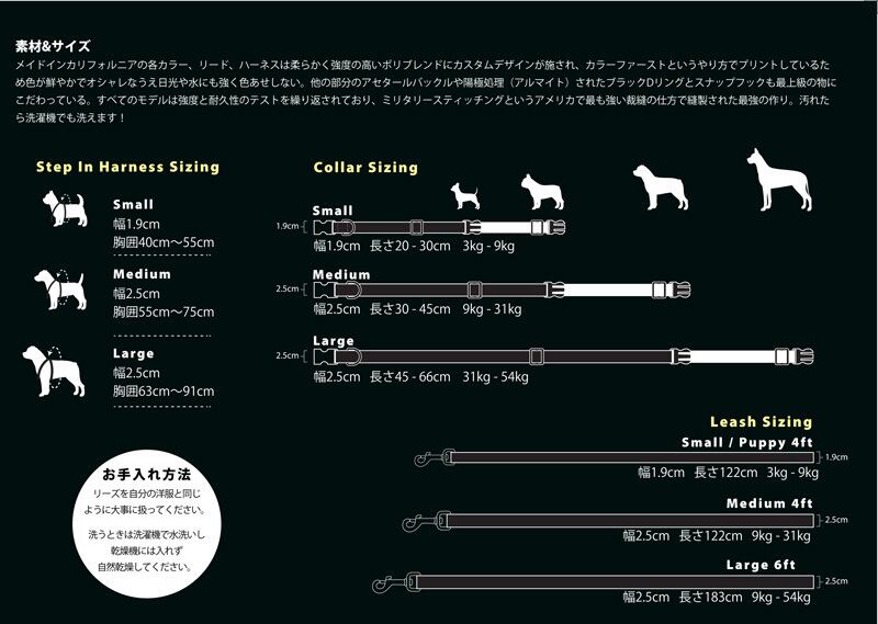 サンディエゴで作られているドッグカラー。素材は柔らかく、強度の高いポリブレンドにカスタムデザインが施され、カラーファーストというやり方でプリントしているため鮮やかなうえ、日光や水にも強く色褪せしない。